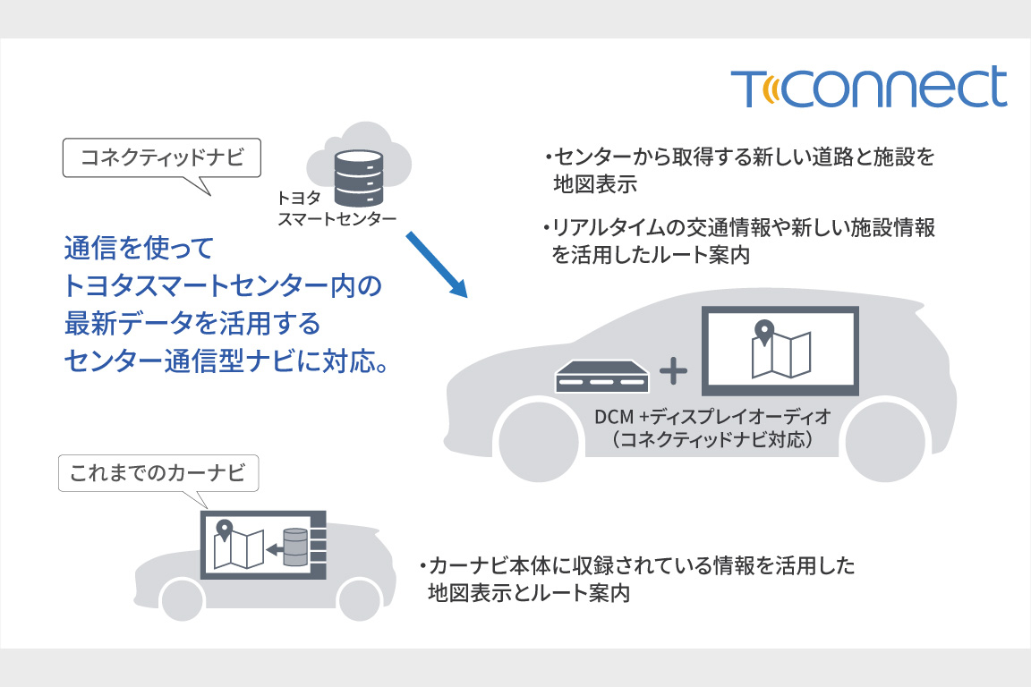 *1. T-Connectスタンダード(22)とコネクティッドナビ(車載ナビ有)の契約が必要です。初度登録日から5年間無料(6年目以降有料)となります。 *2. コネクティッドナビは、専用通信機(DCM)が正常に通信できる環境の場合にご利用いただけます。