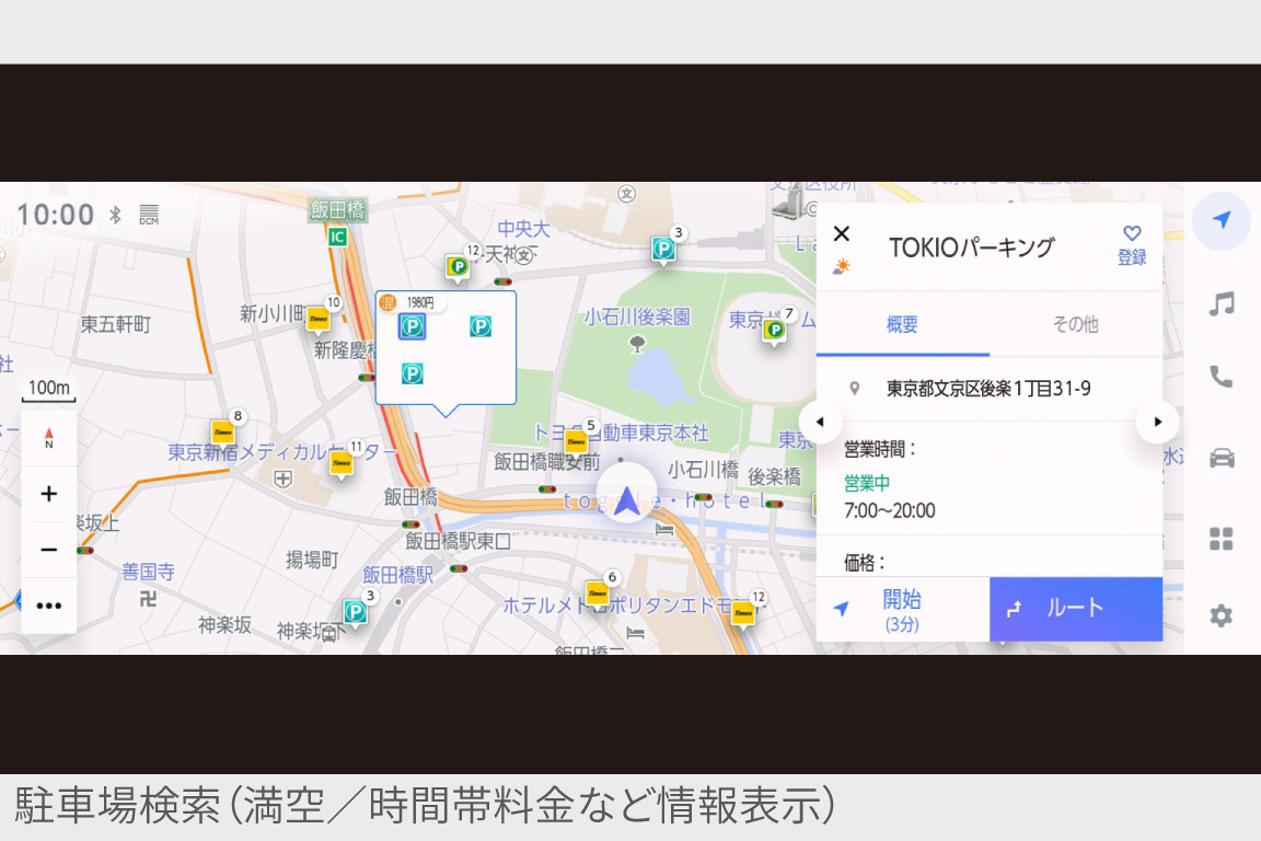 T-Connectの契約でセンター通信型のナビゲーション「コネクティッドナビ」が5年間無料でご利用いただけます。既に収録されているナビ情報を活用するこれまでのカーナビとは異なり、通信によってセンターから取得する新しい情報(地図・施設・交通情報)を活用した目的地検索・ルート設定が可能*2です。また、オンラインによるリアルタイムかつ豊富な情報を活用することができます。例えば、飲食店検索では口コミ点数を検索結果の一覧や地図上に表示、施設情報ではその店の営業時間や定休日を確認することができます。また、駐車場検索では、駐車料金や空き状況を地図上に表示するなど、目的地の選択に役立つ幅広い情報をご提供します。