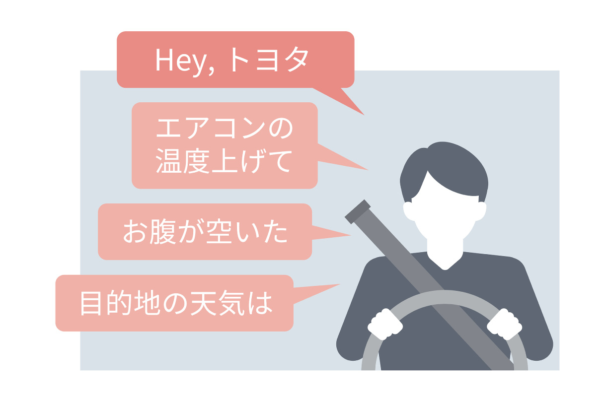 スイッチ操作は不要、あなたの声にクルマが応えます。「Hey,トヨタ」と話しかけるだけで、エージェントが起動して目的地検索や天気予報などの情報をご提供します。また、エアコンの温度調整や窓の開閉など、車両の操作も可能。声によるさまざまなご要望にエージェントがお応えします。