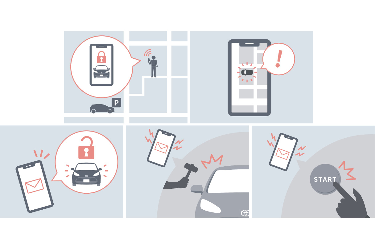 ドアのこじ開けなどによるオートアラーム作動を検知すると「My TOYOTA+」やメール*1にお知らせします。