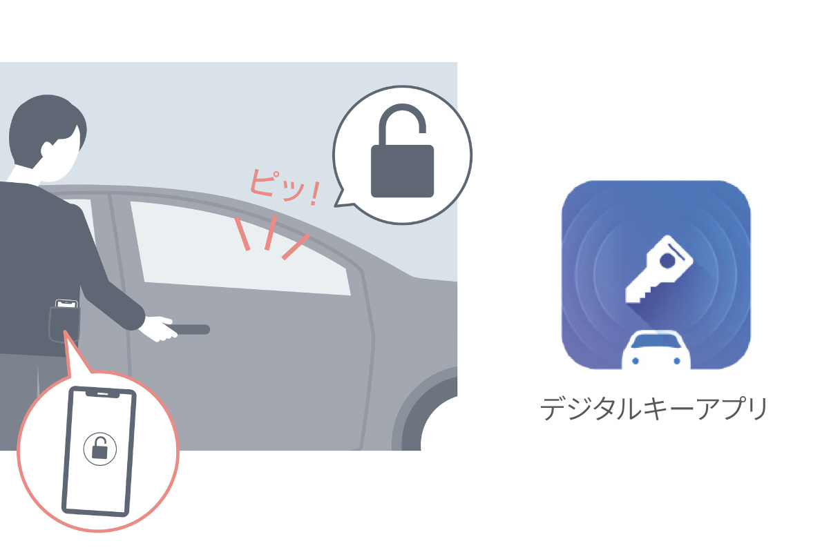 スマートフォンに専用アプリ「デジタルキー」をインストールすることで、スマートフォンをクルマのキーとして使用できます。*4アプリの画面を操作してロック/アンロックが可能になることに加え、アプリを起動したスマートフォンを携帯していれば、画面操作なしでロック/アンロック・クルマの始動をすることも可能です。*5