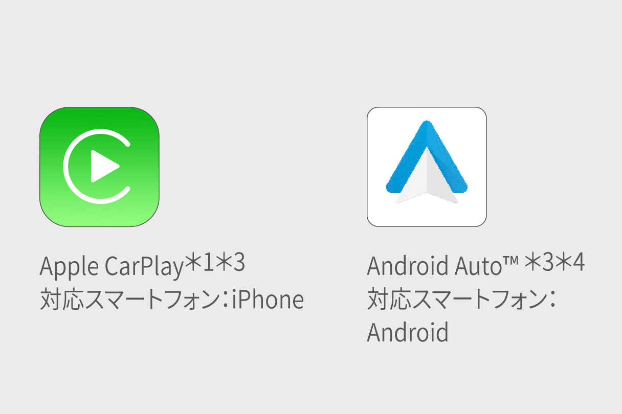 *1. スマートフォンの接続には、データ通信可能なUSBケーブルが別途必要となります。また、一部ケーブルには対応できないものがあります。 *2. 車内Wi-FiとApple CarPlayのワイヤレス接続は同時利用できません。車内Wi-Fiご使用時は、Apple CarPlayをケーブル接続にてご利用ください。 *3. Apple CarPlayをサポートする機種および対応アプリ、接続設定につきましては、(https://www.apple.com/jp/ios/carplay/)でご確認ください。本機での動作を保証しているわけではありません。 *4. AndroidAutoTMをサポートする機種および対応アプリ、接続設定につきましては、(https://www.android.com/auto/)でご確認ください。本機での動作を保証しているわけではありません。 ■Apple CarPlayは、米国その他の国で登録されたApple Inc.の商標です。 ■Android Auto™は、Google LLCの商標です。
