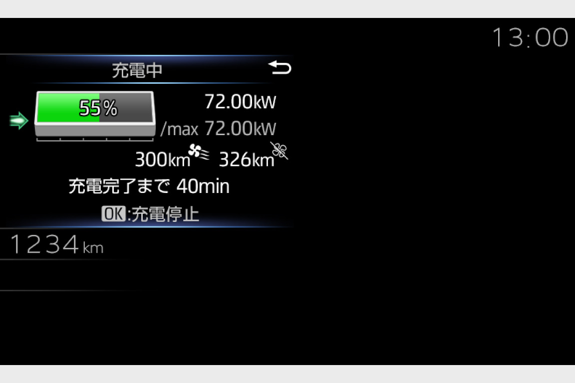 クルマの充電状況の確認、電池残量や航続可能距離などをチェックできます。充電スケジュールの設定や、遠隔操作で今すぐ充電を行うことも可能。外部給電中には、400W消費時の給電可能時間も表示できます。